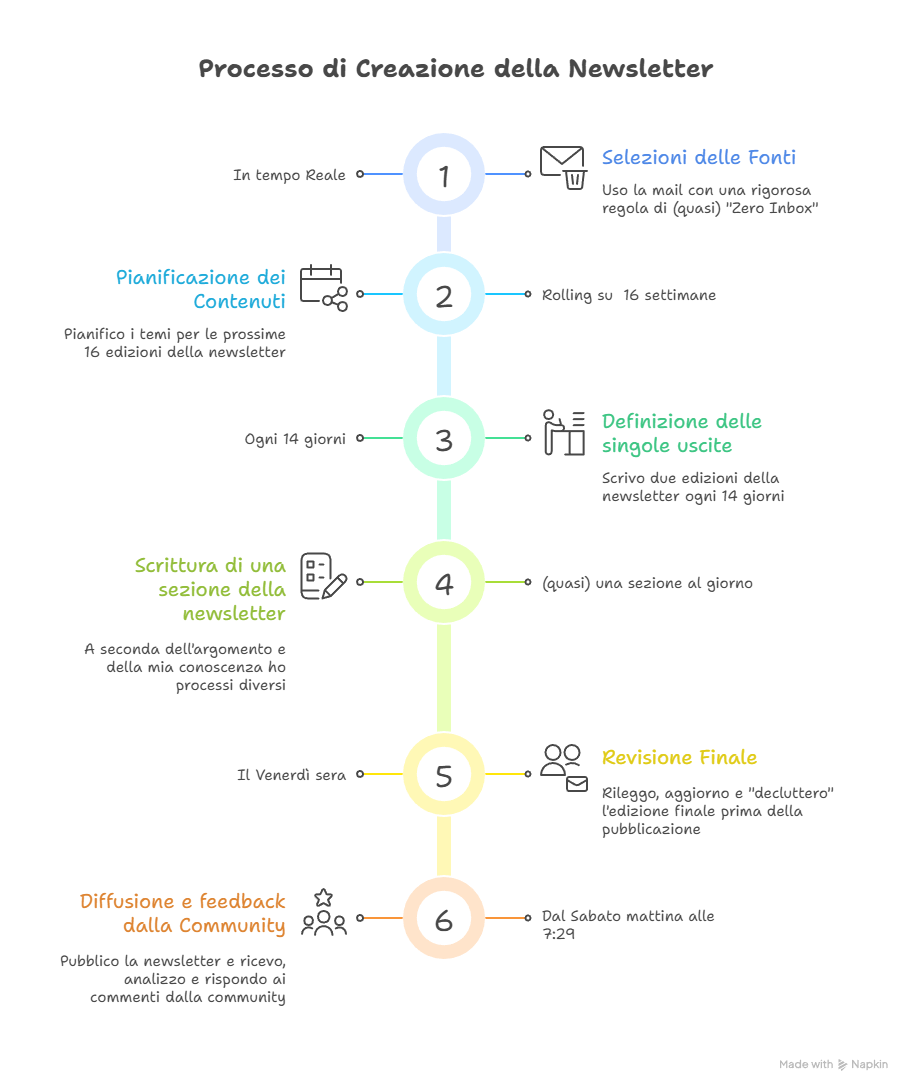 Come scrivevo nella puntata 100, non è facile raccontare in un breve paragrafo come scrivo, ogni settimana da ormai quattro anni, una newsletter. Questa volta provo a raccontarlo per fasi, pur con la limitazione dovuta al fatto che non è un processo completamente sequenziale. So che i modelli e le sequenze, pur non essendo rappresentativi al 100% della realtà, aiutano la comprensione e la comunicazione tra intelligenze umane (e anche con quelle artificiali).