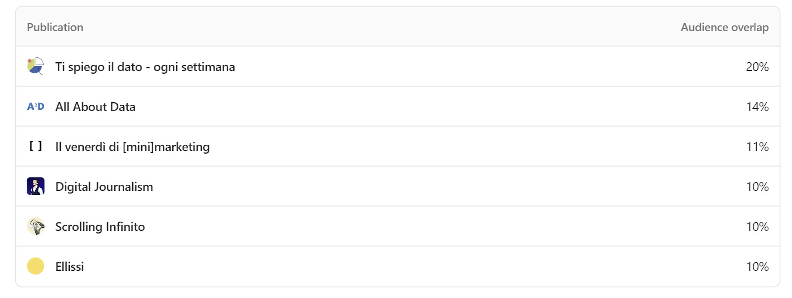 La sovrapposizione di audience più elevata ce l’ho con queste 6 altre newsletter italiane: