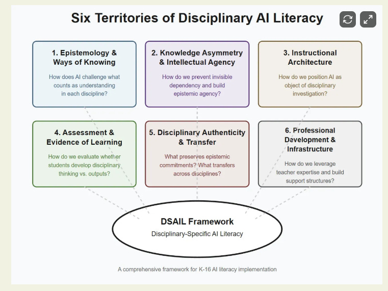 Potkalitsky crea questo framework per il mondo della scuola (americana) ma approfondendolo sono convinto che possa valere allo stesso modo tanto per l’università quanto, forse soprattutto, per le aziende. Perché i problemi che incontriamo nell’uso dell’AI in questa fase di transizione mi sembrano molto comuni. L’idea di fondo è semplice: non puoi insegnare AI literacy in modo generico e trasversale. Devi farlo dentro le discipline, dentro i mestieri, dentro i contesti dove il pensiero conta davvero.